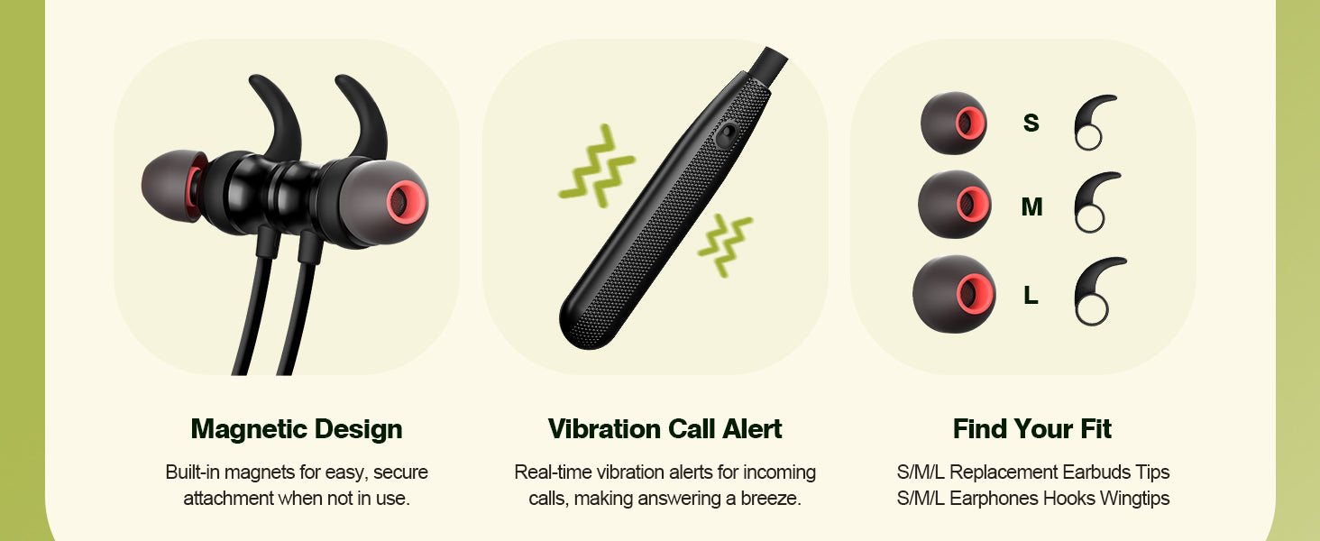 【Secure Fit】Lightweight neckband, ear hooks, and 6 silicone eartips for all-day comfort.