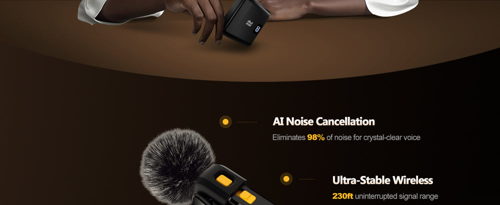 - AI-Powered Noise Cancellation: Rythflo wireless microphones use AI-driven noise cancellation to block out background noise, ensuring clear, professional audio in noisy environments